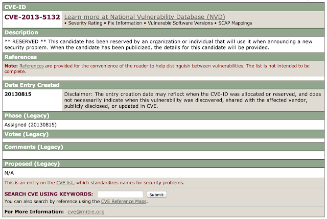 Pero es que tan poca información hay en este caso sobre los CVE de esta actualización, que hoy 8 de Septiembre aún no se habían publicado los detalles del CVE-2013-5132 en la base de datos de seguridad del Mitre para saber exactamente qué versiones y que productos en concreto están afectados. ¿Son todos? ¿Todas las versiones anteriores? ¿Sólo algunos?