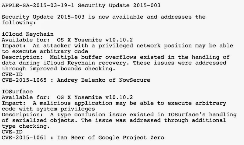 Apple ha lanzado de emergencia ayer mismo Apple Security Update 2015-003 para sistemas operativos OS X Yosemite. Esta actualización de seguridad es un parche acumulativo sobre Apple Security Update 2015-002 - de hecho todo el contenido de seguridad de éste está incluido en este nuevo paquete -. Los CVE arreglados en esta ocasión son 2 y están publicados en el Advisory de Seguridad.