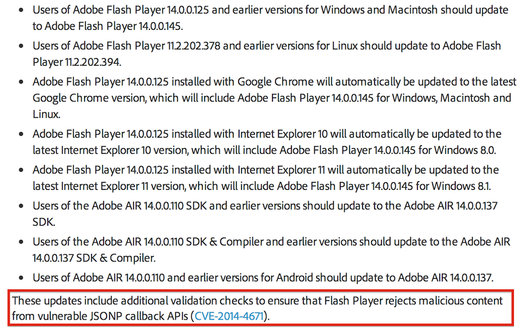 Adobe ha actualizado rápidamente su player Flash para los navegadores, con el objeto de evitar que desde un callback le inyecten Flash maliciosos. Están descritos las actualizaciones en el boletín de seguridad de Adobe Flash Player.