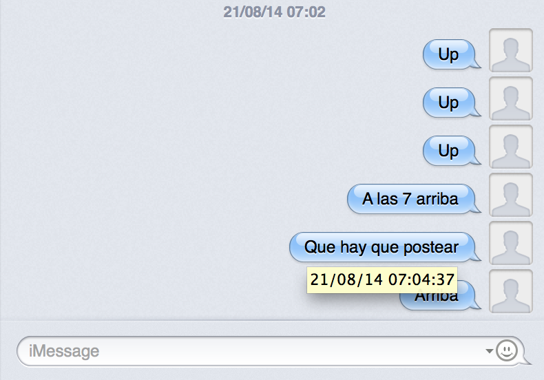 Por otro lado, alguien más acostumbrado a iMessage que nosotros nos contó que sí que existe una forma de de ver la fecha y la hora exacta, no de todos los mensajes a la vez, pero sí uno a uno. Basta con dejar el cursor unos instantes quieto sobre cada mensaje para que salga un tooltip con la fecha y la hora del mismo.