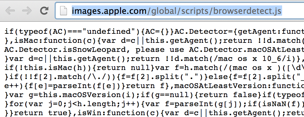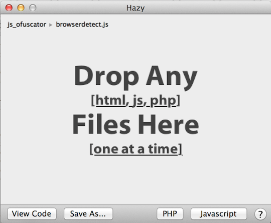 Su funcionamiento es sencillo, este de aquí es el código de un fichero JS que utiliza la web de Apple.com para detectar el navegador de Internet. Se guarda, se arrastra a Hazy y se guarda como fichero JS ofuscado haciendo clic en el botón Save As. Eso es todo.