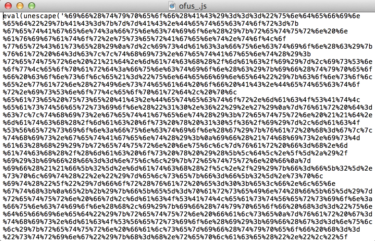 Una vez que se visualiza el código, se puede ver que ha utilizado un sistema basado en eval y unescape para ofuscar todo el contenido. Si hay algún WAF filtrando código o un usuario quiere desofuscarlo, deberá pararse a utilizar un poco de tiempo para ver qué es lo que ponía ahí.
