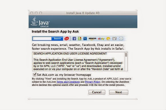 Para evitar el Adware en su totalidad, los usuarios deben pulsar "Cancelar" cuando se muestre en pantalla la opción "Instalar el Search App de Ask". Este hecho es contrario a la intuición del usuario, ya que todos los otros pasos del proceso de configuración requieren que el usuario haga clic en siguiente para avanzar en el proceso. Por lo que es una pequeña trampa que se ha introducido en el instalador de Java, y si el usuario hace clic en siguiente en este paso, instalará la molesta barra de herramientas, incluso cuando la casilla "Asignar Ask.com como página de inicio del navegador" está desactivada.