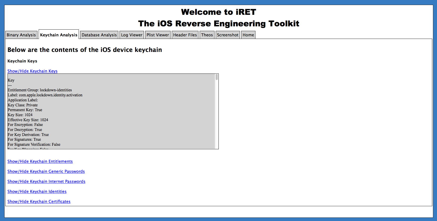 La herramienta permite analizar, por ejemplo, los keychains de una app, o ver cómo se realiza la gestión de datos en las bases de datos SQLite, todo de forma automatizada.- Keychain Analysis (keychain_dumper)