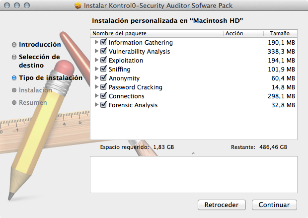 K0SASP es un paquete de instalación que incluye un gran numero de programas como los que se encuentran en Kali Linux o Back Box, pero portados a Mac OS X, ordenados y organizados por categorías. Sin la necesidad de tener que buscarlos ni compilarlos. Por debajo de este Paquete de Instalación corren una serie de scripts que son los encargados de desplegar cada una de las aplicaciones. Gracias a éstos también se instala el software de terceros que se requiera para la el funcionamiento de otras aplicaciones. Su uso y configuración son sencillos ya que como en cualquier otra instalación que incluya más de un software nos permitirá seleccionar cuál de ellos queremos instalar.