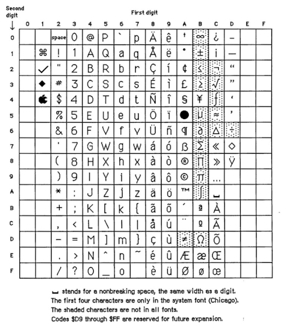Pero volvamos por un momento a los años 80. Susan Kare estaba trabajando en el nuevo Macintosh y en concreto en los tipos de letras (fonts). Crearlos desde cero era todo un logro debido a la poca memoria disponible de estos primeros ordenadores Apple. Sólo era posible tener 256 caracteres, incluidos los de control, símbolos y los clásicos ASCII, pero además se creaban con sólo 8x8 o 16x16 pixeles. Entonces Susan comenzó a trabajar en los tipos de letra y creó el primero de ellos que llamó Mac Roman: