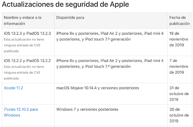 Figura 1. Listado de algunas vulnerabilidades mostradas en la web de Apple. Fuente. |