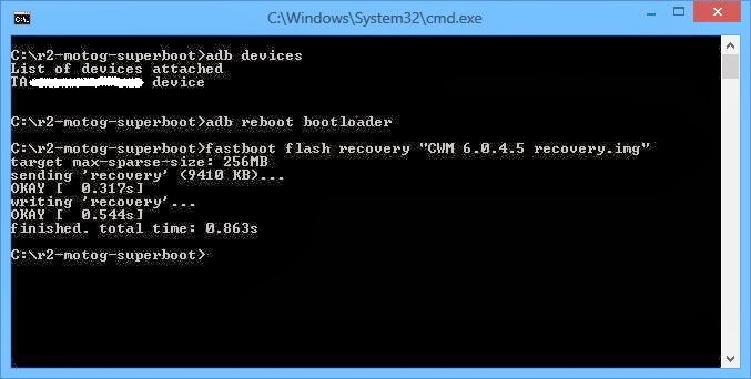 Una vez hemos comprobado que funciona correctamente y hemos elegido cual de los dos recoverys nos gusta más lo instalaremos definitivamente en el teléfono con la orden:fastboot flash recovery archivo.img