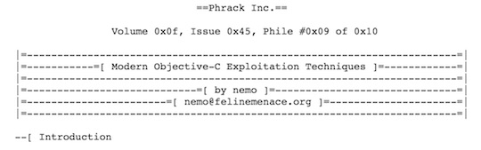En la Phrack Magazine número 69 publicada en este mes de Mayo, se han incluido una serie de interesantes artículos para los hackers. Entre ellos, hay dos que nos gustaría destacaros si estáis aquí porque vuestro interés se centra - sobre todo - en lo que a Apple atañe. El primero de los artículos está centrado en Objetive-C, y bajo el título de "Modern Objective-C Exploitation Techniques" explica algunas de las formas más modernas y avanzadas para explotar bugs en aplicaciones escritas en Objetive-C. Saca tiempo y concentrate, porque el artículo es largo y exhaustivo.