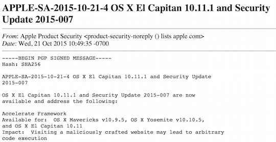 Apple esta semana ha lanzado al mercado una buena cantidad de actualizaciones de seguridad, y si tienes la última versión de OS X en tu Mac, debes ponerte todas las que te afectan, que son varias. Hoy os traemos las que tienen que ver con OS X El Capitan, que llega a us versión 10.11.1 arreglando un total de 60 CVEs de seguridad, muchos de ellos de severidad crítica. Para las versiones anteriores de OS X se ha puesto en circulación la Security Update 2015-007 que trae los parches para OS X Yosemite y OS X Mavericks. Recordad que los sistemas anteriores ya están sin soporte. Todos los bugs los tienes descriptos en le Security Advisory asociado.