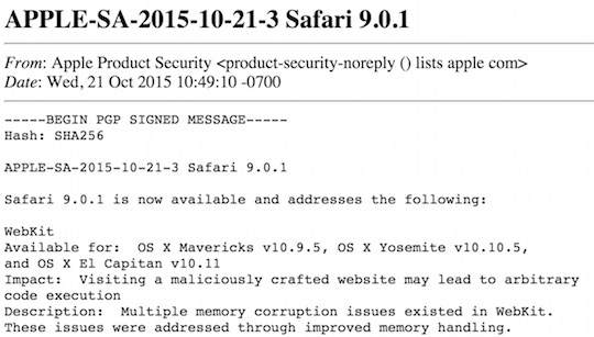 También Apple ha actualizado Apple Safari 9.0.1 con un total de 9 CVEs de seguridad de severidad crítica, así que hay que actualizar lo antes posible. La lista de bugs corregidos está descrita en el siguiente Security Advisory:
