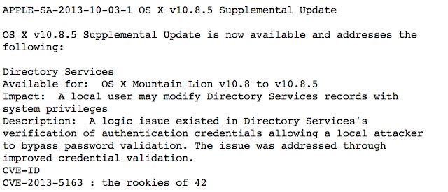 Durante el mes de septiembre Apple puso en circulación OS X Mountain Lion 10.8.5, pero por lo que se puede comprobar, esta actualización tiene un fallo de seguridad grande en el servicio de directorio que permite que un usuario evada el sistema de autenticación sin conocer la contraseña. Esto ha hecho que Apple re-publique OS X 10.8.5 para las versión normal y versión "Combo", que además son las que ya están disponibles vía Mac App Store.
