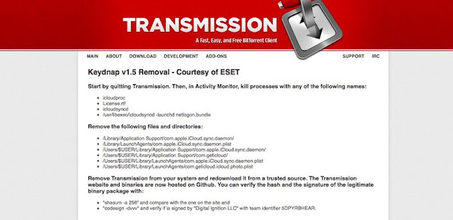 La firma incluida en el instalador de Transmission no pertenece a los desarrolladores legítimos. Apple ha informado acerca de dicha firma, y se desconoce si ha sido revocada en estos momentos. Los desarrolladores de Transmission publicaron inmediatamente de conocer la notiica una nueva versión para todos los usuarios. Si eres uno de los usuarios que instalaron Transmission entre el 28 y 29 de agosto debes mirar estos directorios y archivos: