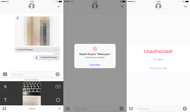 Para utilizarlo lo primero que debemos hacer es buscarla e instalarla desde la tienda de apps de iMessage, aparece el icono de la App Store al lado de la entrada de texto del mensaje, o bien desde la App Store teniendo en cuenta que cuando se descargue no se va a encontrar ningún icono en el Springboard, sino que vamos a poder acceder a esta característica a la hora de escribir en la plataforma de mensajes de Apple. Si queremos enviar un mensaje “seguro”, únicamente tenemos que seleccionar el icono de la App Store a la hora de enviar el mensaje y buscar Cloak It. Ahí se nos activará la cámara y se puede tomar una foto rápida y mandarla pixelada hasta que se desbloquee el mensaje o bien pulsar sobre la “T” para enviar texto. A la hora de recibirlo pedirá introducir el touch ID para ver el contenido. En el caso de fallar, aparecerá un mensaje de aviso de acceso no autorizado y tendremos la posibilidad de desbloquear el mensaje con una contraseña que se establece la primera vez que se utiliza la aplicación.