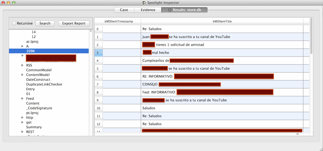 El resultado es una estructura en la que puedes ver todos los metadatos de todos los elementos que tiene indexado el sistema SpotLight de cada uno de los objetos. Por ejemplo, de los correos electrónicos o las páginas web visitadas hay información casi completa, por lo que si el usuario ha borrado el correo, pero tenemos copias de las bases de datos de SpotLight se podrá seguir contando con esa información.