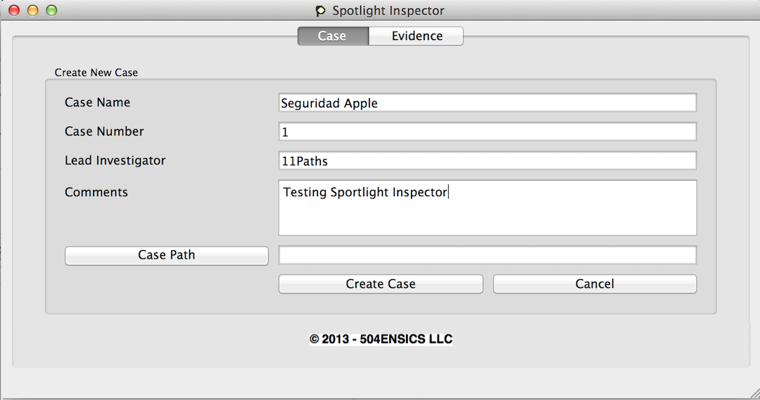 La herramienta SpotLight Inspector, que puede ser descargada para OS X proporcionando únicamente un nombre y un correo electrónico, se encarga de analizar dicha base de datos y extraer toda la información que de cada elemento la aplicación SpotLight almacena. Una vez que se arranca, como toda herramienta centrada en el análisis forense, genera un caso nuevo en el que se añaden todas las evidencias posibles.