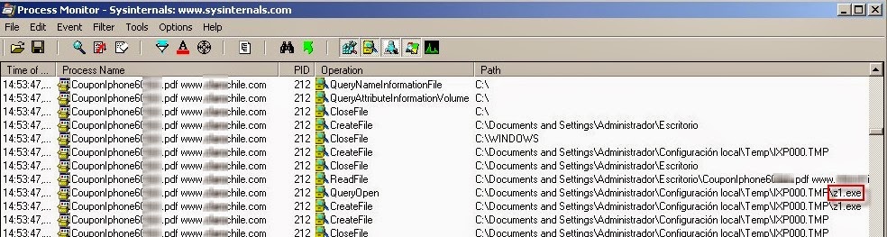 Hemos visto el análisis dinámico que han llevado a cabo de la amenaza y ésta genera información de un comportamiento interesante por parte del malware. El binario que se descarga y se ejecuta es inferior a 1 MB. Cuando se realiza su ejecución parece no ocurrir nada, pero analizando los procesos de memoria se puede visualizar como se crea un archivo en una carpeta del sistema, y una vez que se termina su escritura se cierra el proceso inicial, ejecutando el archivo recién creado.